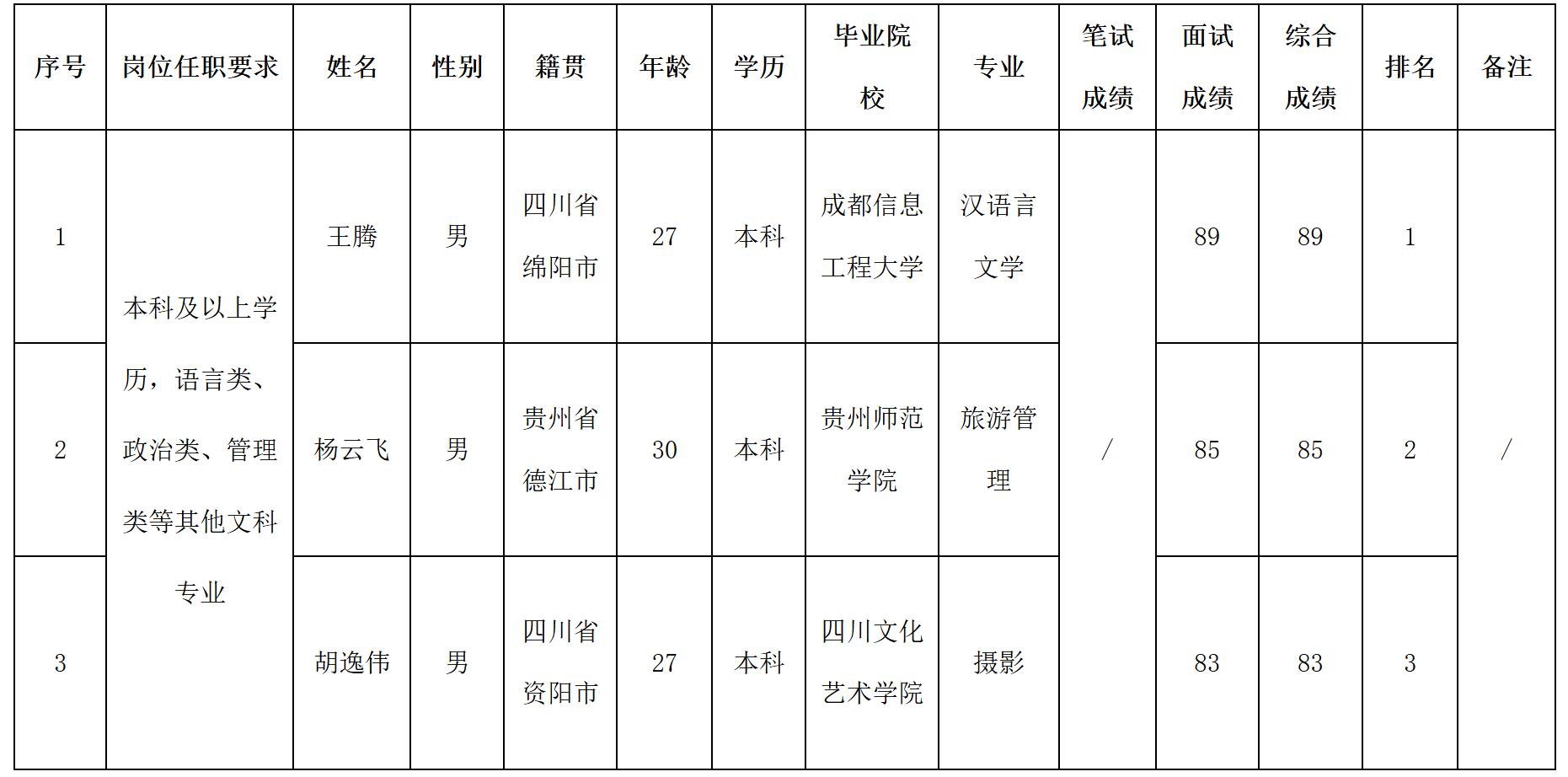 根據(jù)四川波鴻實(shí)業(yè)有限公司發(fā)布的招聘公告及招聘相關(guān)規(guī)定,經(jīng)面試等程序,現(xiàn)將面試成績(jī)予以公示。