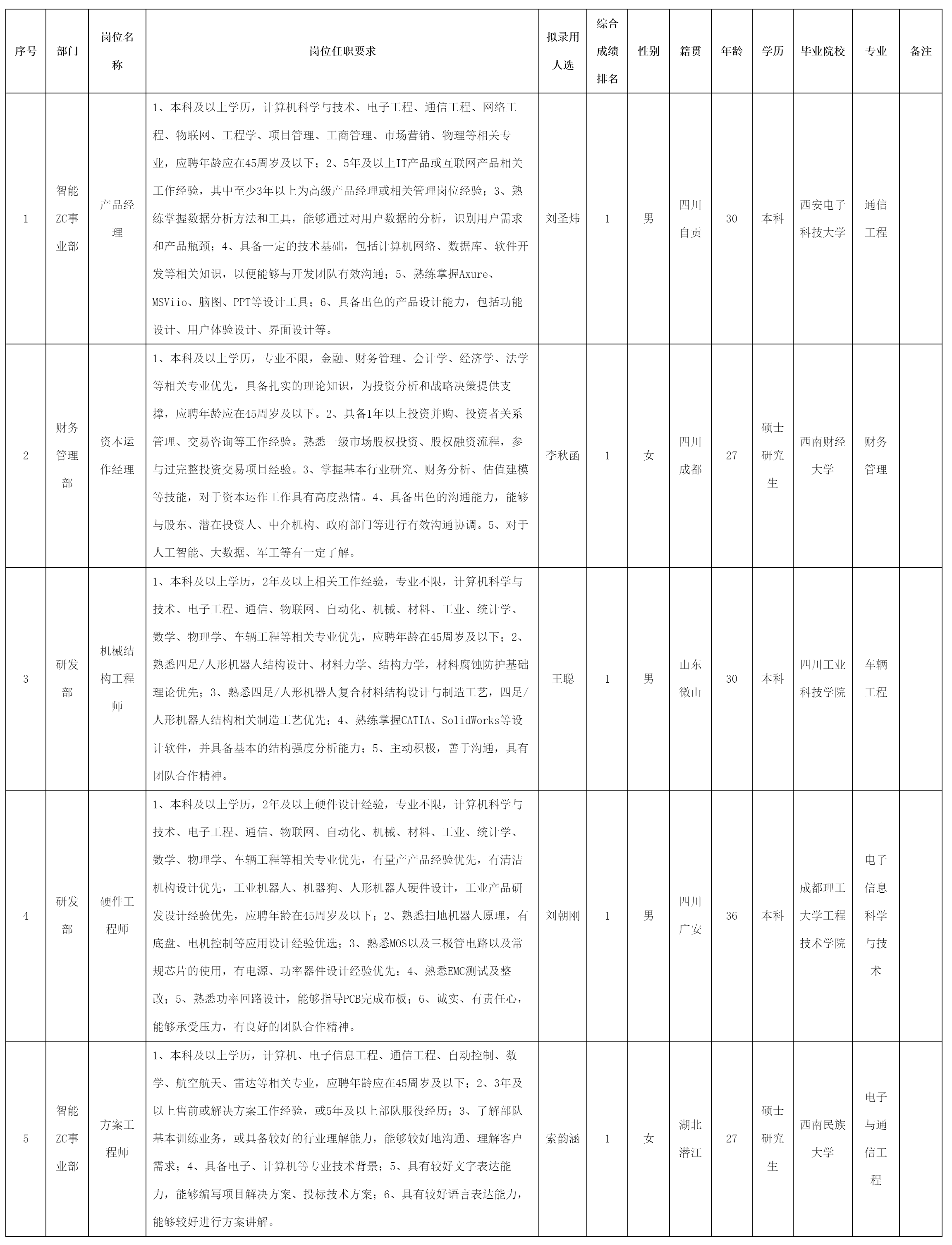 根據(jù)四川九洲投資控股集團(tuán)有限公司軟件與數(shù)據(jù)智能軍團(tuán)發(fā)布的招聘公告及招聘相關(guān)規(guī)定,經(jīng)筆試、面試、考察、體檢等程序,擬錄用劉圣煒等5名同志到四川九洲投資控股集團(tuán)有限公司軟件與數(shù)據(jù)智能軍團(tuán)工作,現(xiàn)予以公示,具體情況如下: