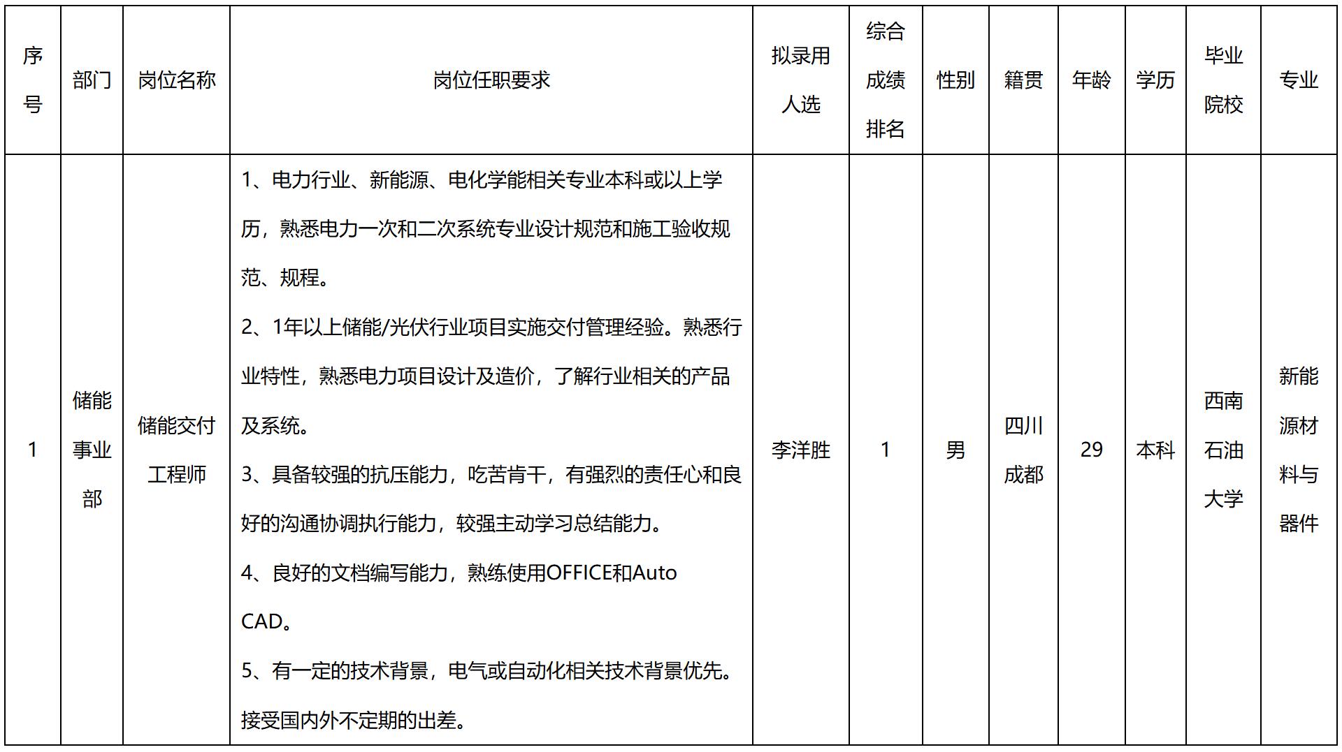 根據(jù)四川長(zhǎng)虹電源股份有限公司發(fā)布的招聘公告及招聘相關(guān)規(guī)定,經(jīng)面試、考察、體檢等程序,擬錄用李洋勝同志到我司工作,現(xiàn)予以公示,具體情況如下: