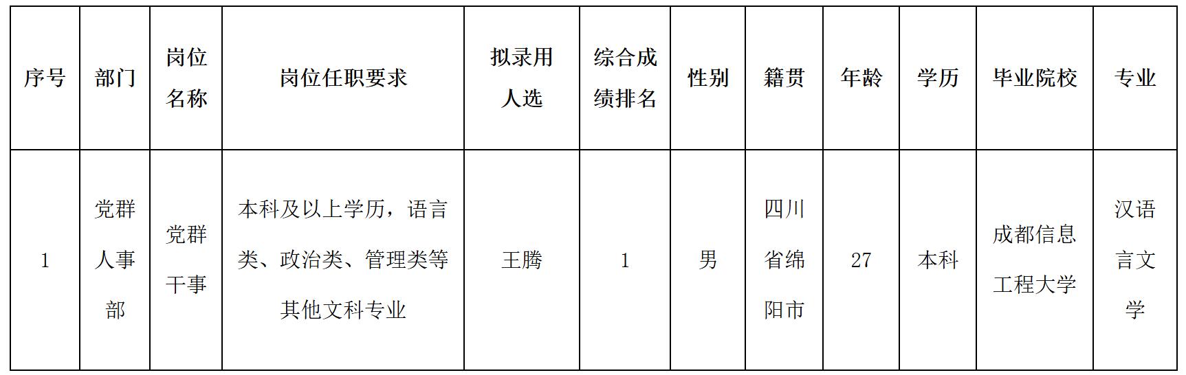 根據(jù)四川波鴻實(shí)業(yè)有限公司發(fā)布的招聘公告及招聘相關(guān)規(guī)定,經(jīng)面試、體檢等程序,擬錄用王騰同志到四川波鴻實(shí)業(yè)有限公司工作,現(xiàn)予以公示,具體情況如下: