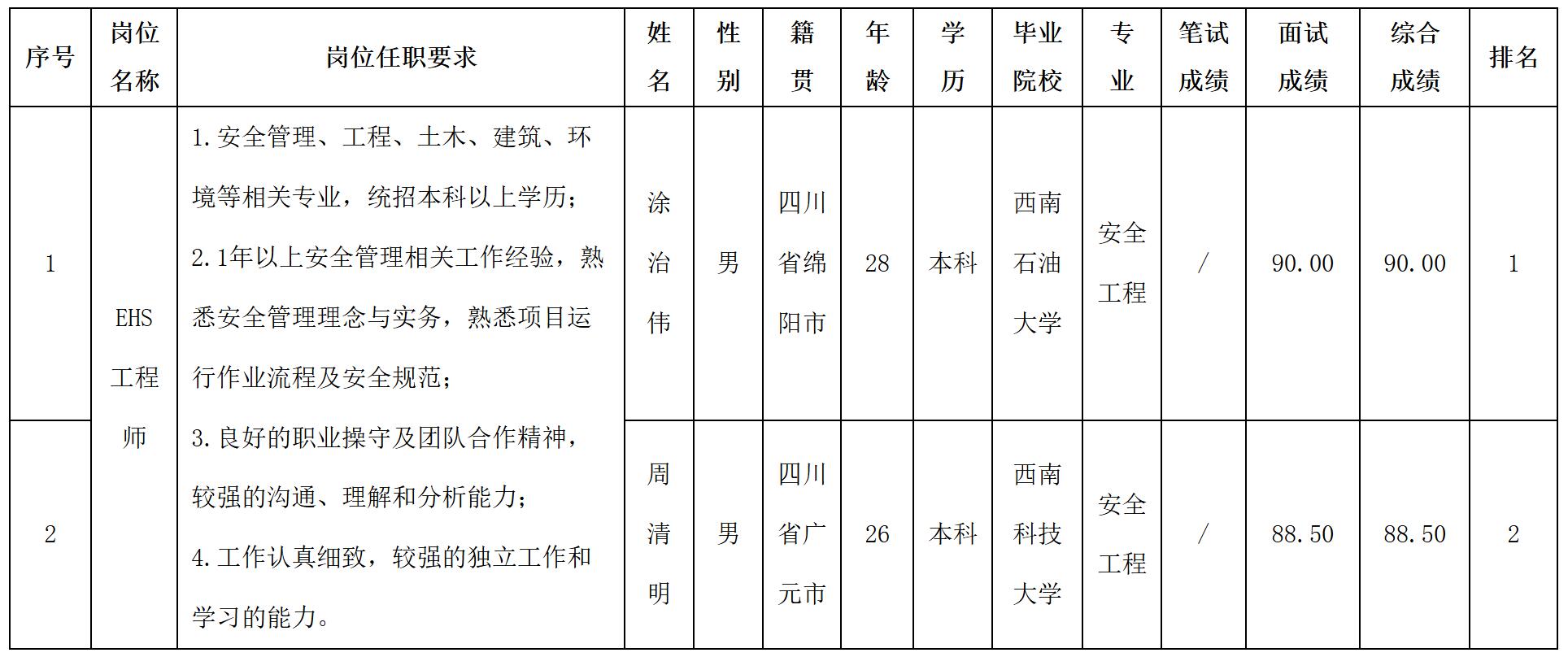 根據(jù)四川波鴻實業(yè)有限公司發(fā)布的招聘公告及招聘相關規(guī)定,經(jīng)面試等程序,現(xiàn)將面試成績予以公示。