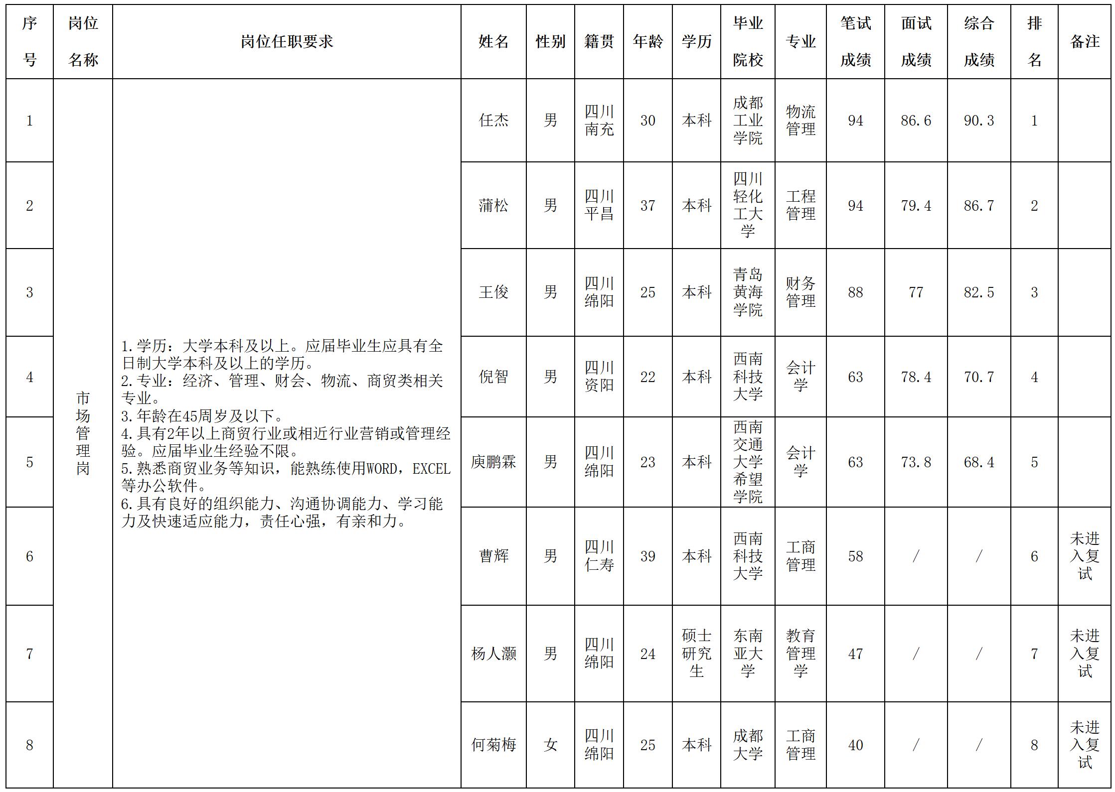 根據(jù)大道供應(yīng)鏈公司發(fā)布的招聘公告及招聘相關(guān)規(guī)定,經(jīng)筆試、面試等程序,現(xiàn)將成績(jī)予以公示。