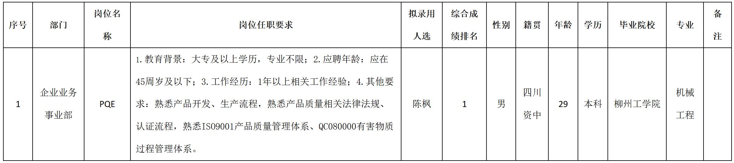 根據(jù)四川九州電子科技股份有限公司發(fā)布的招聘公告及招聘相關規(guī)定,經筆試、面試、考察、體檢等程序,擬錄用陳楓同志到四川九州電子科技股份有限公司工作,現(xiàn)予以公示,具體情況如下: