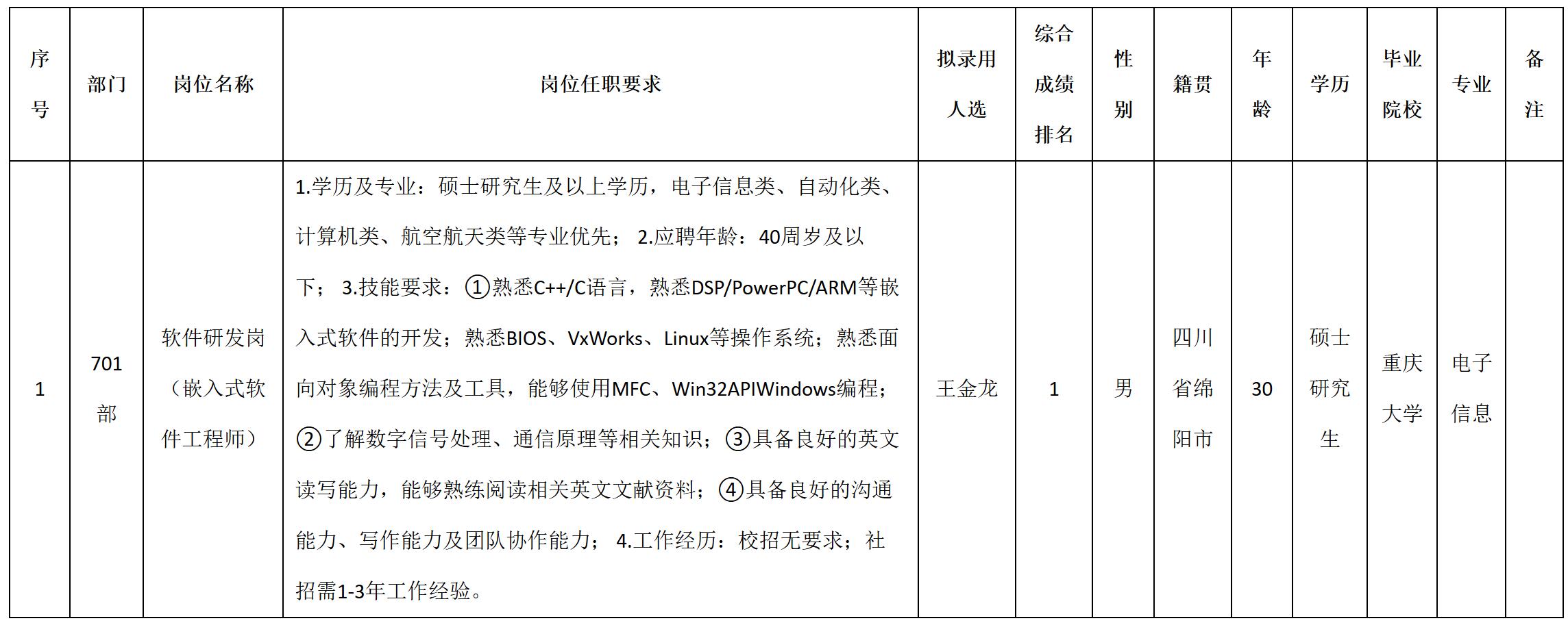 根據(jù)四川九洲電器集團(tuán)有限責(zé)任公司發(fā)布的招聘公告及招聘相關(guān)規(guī)定,經(jīng)筆試、面試、考察、體檢等程序,擬錄用王金龍同志到四川九洲電器集團(tuán)有限責(zé)任公司工作,現(xiàn)予以公示,具體情況如下: