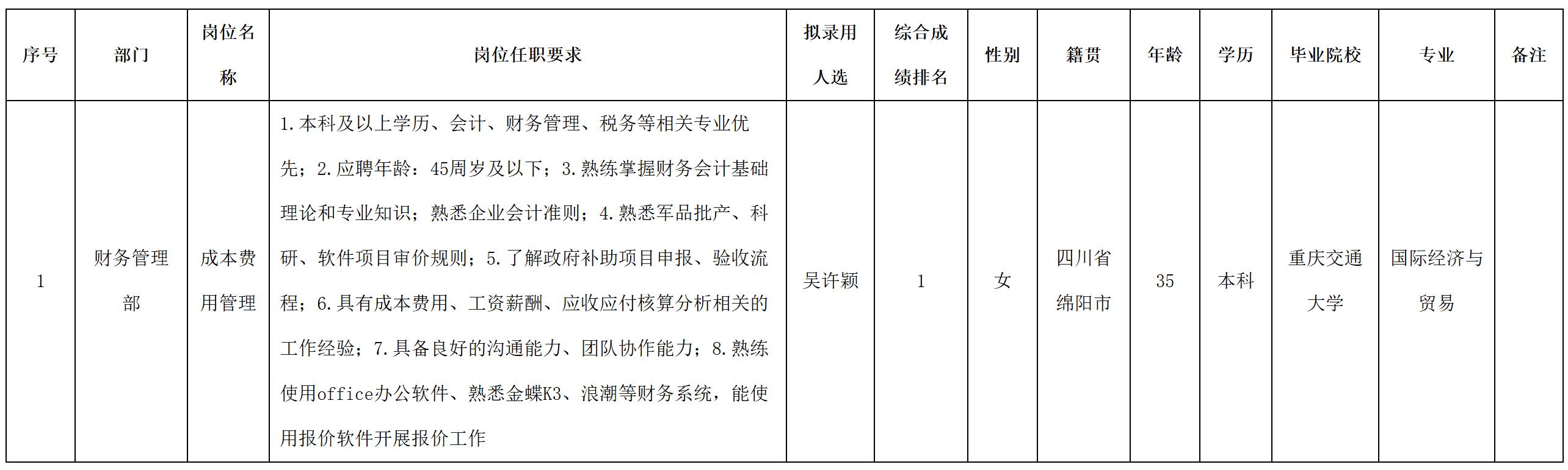 根據(jù)四川九洲防控科技有限責(zé)任公司發(fā)布的招聘公告及招聘相關(guān)規(guī)定,經(jīng)筆試、面試、考察、體檢等程序,擬錄用吳許穎同志到四川九洲防控科技有限責(zé)任公司工作,現(xiàn)予以公示,具體情況如下: