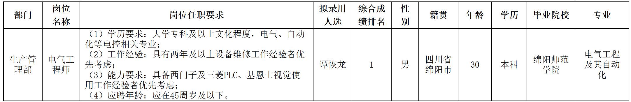 根據(jù)四川長虹杰創(chuàng)鋰電科技有限公司發(fā)布的招聘公告及招聘相關(guān)規(guī)定,經(jīng)面試、考察、體檢等程序,擬錄用譚恢龍同志到長虹杰創(chuàng)工作,現(xiàn)予以公示,具體情況如下: