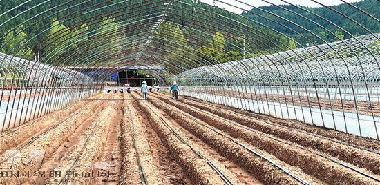 蜀美家庭農場大棚內,工人們正在起壟移栽