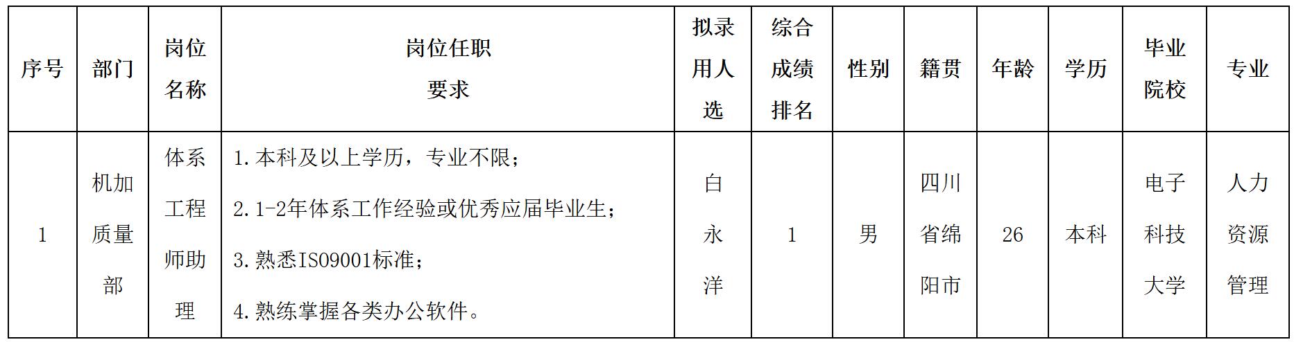 根據(jù)四川波鴻實(shí)業(yè)有限公司發(fā)布的招聘公告及招聘相關(guān)規(guī)定,經(jīng)面試、體檢等程序,擬錄用白永洋同志到威斯卡特(綿陽)汽車零部件制造有限公司工作,現(xiàn)予以公示,具體情況如下: