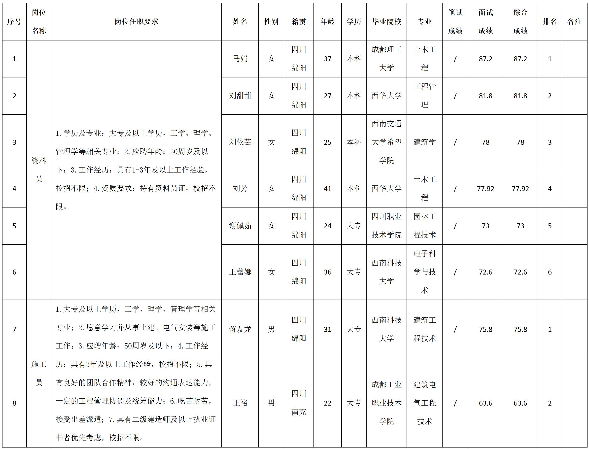 根據(jù)四川九洲建筑工程有限責(zé)任公司發(fā)布的招聘公告及招聘相關(guān)規(guī)定,經(jīng)筆試、面試等程序,現(xiàn)將筆試(面試)成績(jī)予以公示。
