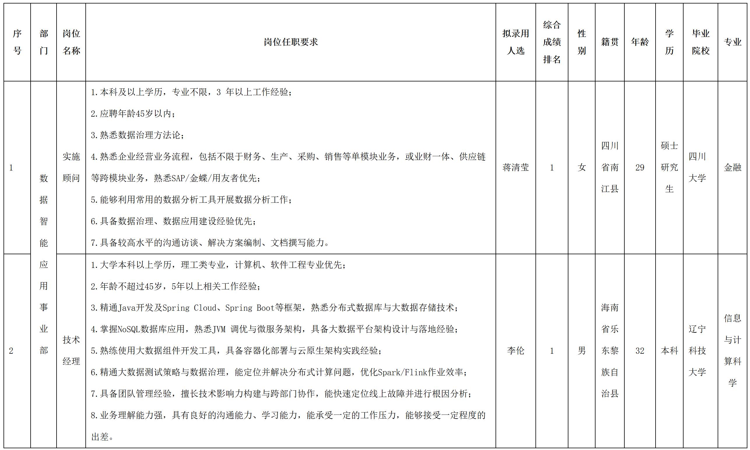 根據(jù)四川虹信軟件股份有限公司發(fā)布的招聘公告及招聘相關(guān)規(guī)定,經(jīng)面試、考察、體檢等程序,擬錄用蔣清瑩、李倫同志到四川虹信軟件股份有限公司工作,現(xiàn)予以公示,具體情況如下: