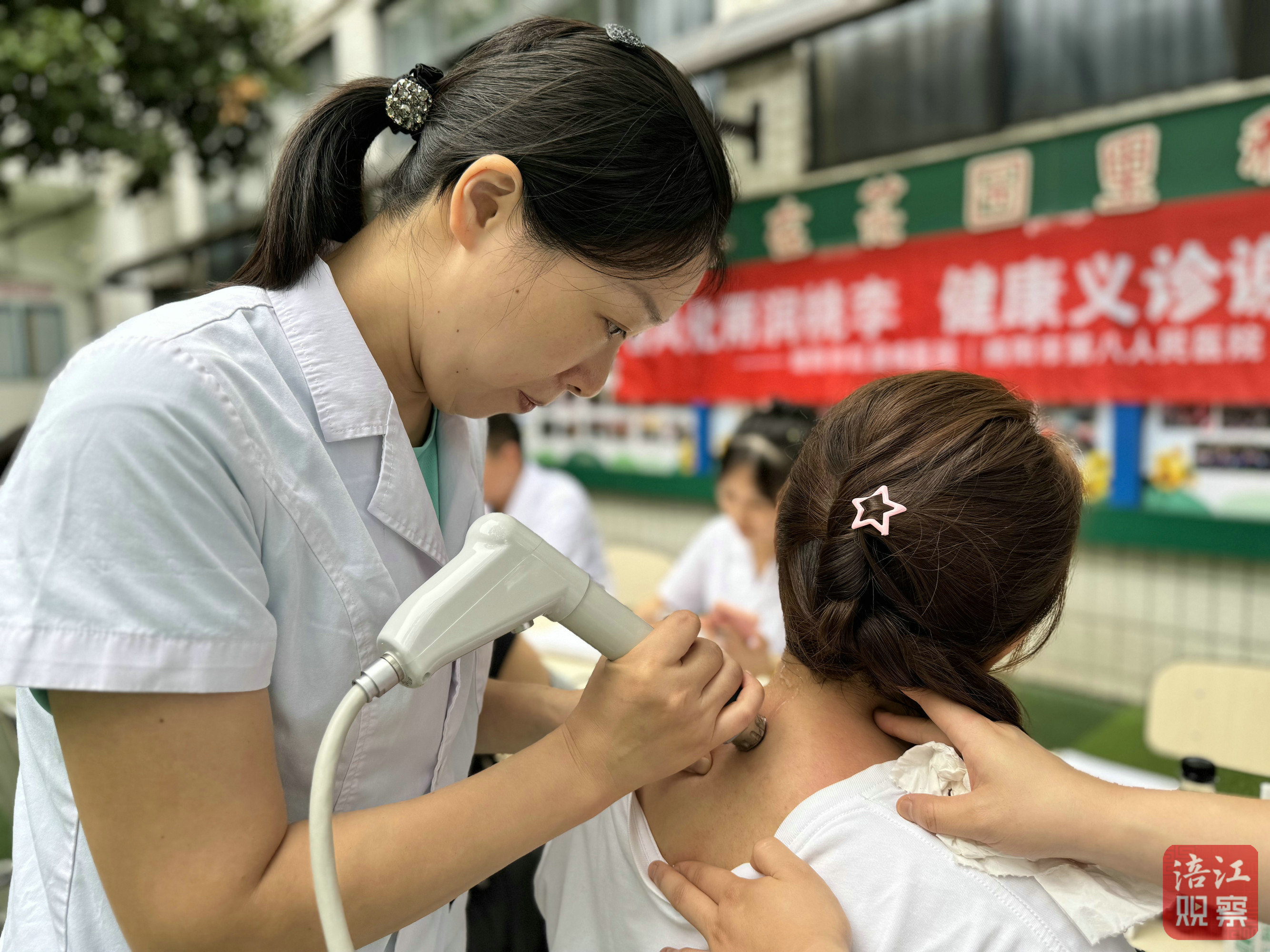 “長期上課,咽喉不適是常事,除了吃緩解咽喉疼痛的藥還可以怎么調(diào)理?”“經(jīng)常批改作業(yè),時間長了不僅容易腰背酸痛,肩頸還僵硬,很難受......”面對前來咨詢的教師,義診醫(yī)生楊云耐心地提供專業(yè)意見,還利用“獨龍針”“浮針”等特色針灸技術(shù),配合“沖擊波”治療儀深入舒緩老師們的病痛,引來眾多教師參與體驗。