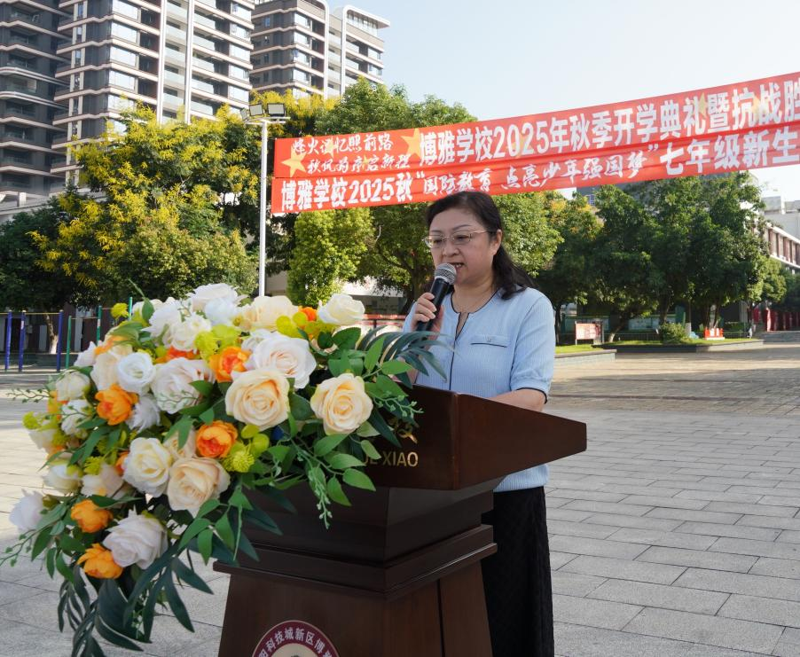 博雅學(xué)校校長(zhǎng)唐慧在新學(xué)期致辭中,對(duì)同學(xué)們提出了殷切的期望。她希望同學(xué)們從楊靖宇等先輩身上明白愛國真諦,努力學(xué)習(xí),成長(zhǎng)為有擔(dān)當(dāng)?shù)臅r(shí)代新人。
