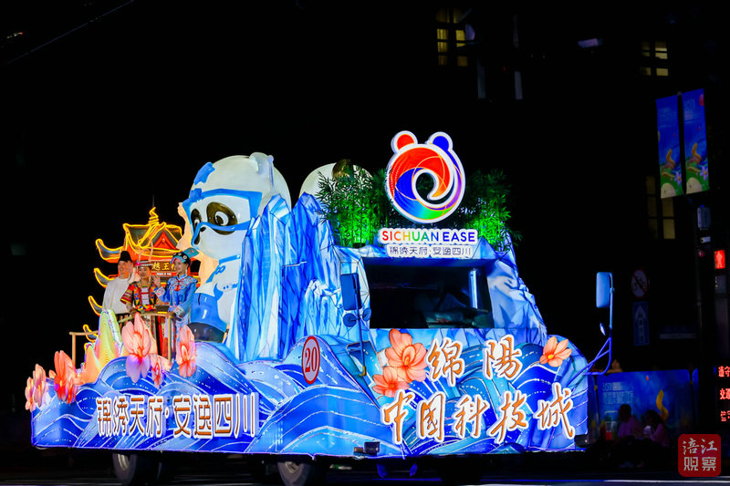 “看,是李白!”當(dāng)流光溢彩的綿陽花車登場時(shí),人群中傳來不少人的驚呼。只見車頭“四川文旅”與“綿陽中國科技城”的標(biāo)識(shí)在霓虹中交相輝映,自雪寶頂冰川奔涌而下的涪江水,幻化成藍(lán)色綢帶纏繞車身。