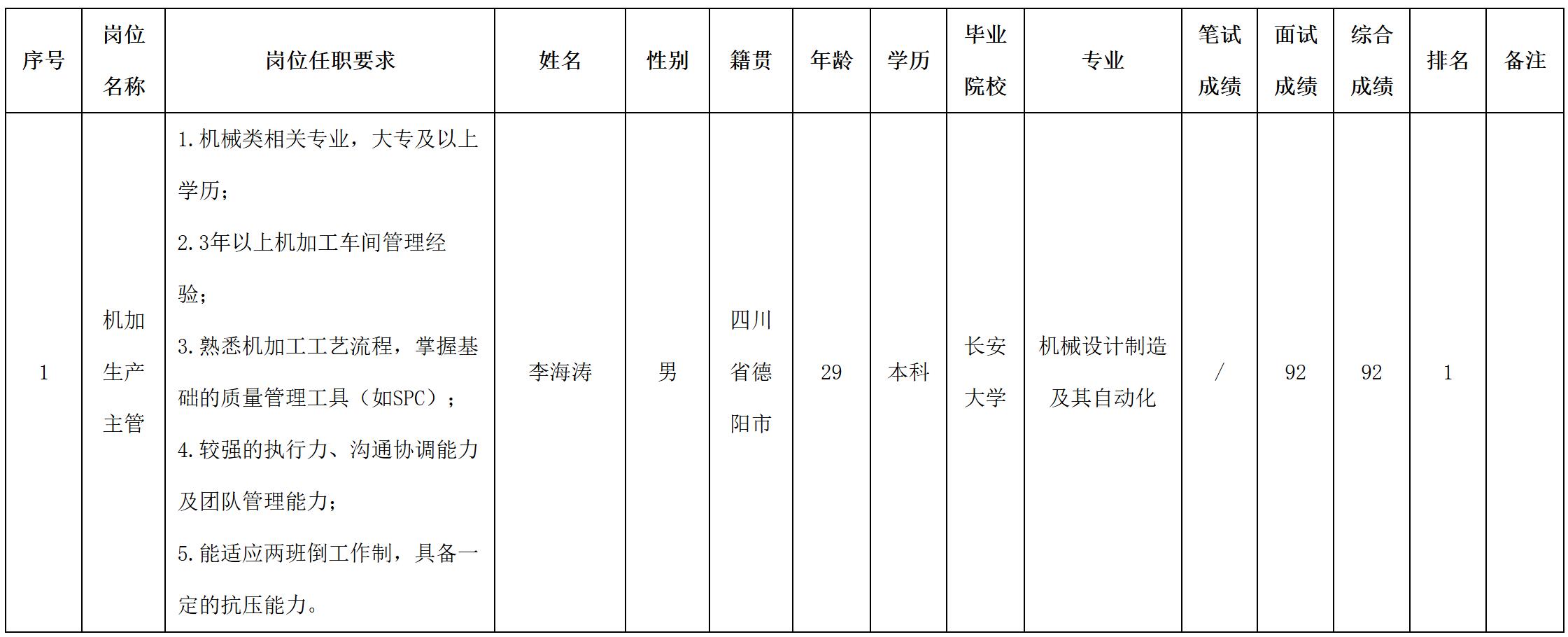 根據(jù)四川波鴻實(shí)業(yè)有限公司發(fā)布的招聘公告及招聘相關(guān)規(guī)定,經(jīng)面試等程序,現(xiàn)將面試成績予以公示。