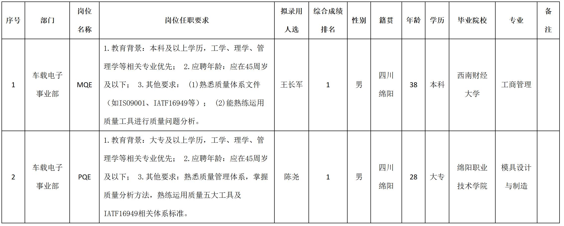 根據(jù)四川九州電子科技股份有限公司發(fā)布的招聘公告及招聘相關(guān)規(guī)定,經(jīng)筆試、面試、考察、體檢等程序,擬錄用王長(zhǎng)軍等2名同志到四川九州電子科技股份有限公司工作,現(xiàn)予以公示,具體情況如下: