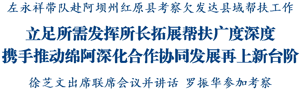 綿陽新聞網(wǎng)訊 9月15日至16日,省委常委、市委書記左永祥帶隊赴阿壩州紅原縣考察欠發(fā)達縣域幫扶工作,看望慰問我市結(jié)對幫扶干部人才代表,出席綿陽市結(jié)對幫扶阿壩州紅原縣、壤塘縣聯(lián)席會議并講話。副省長、阿壩州委書記徐芝文出席聯(lián)席會議并講話。
