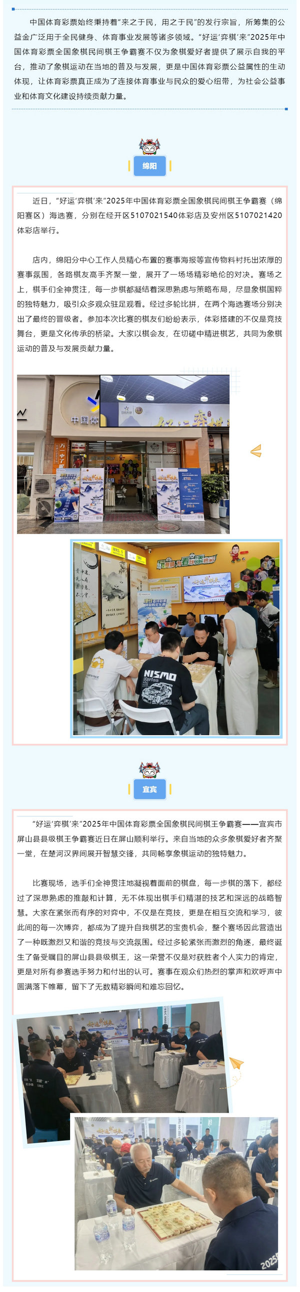 近日,“好運(yùn)‘弈棋’來”2025年中國體育彩票全國象棋民間棋王爭霸賽(綿陽賽區(qū))海選賽,分別在經(jīng)開區(qū)5107021540體彩店及安州區(qū)5107021420體彩店舉行。