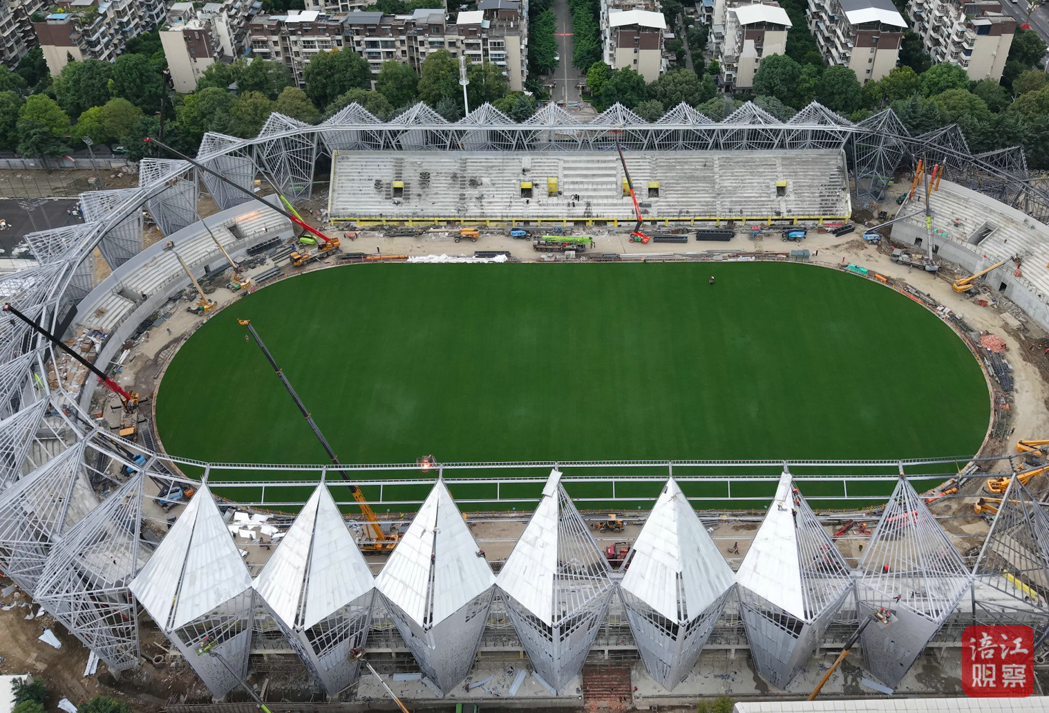 記者在現(xiàn)場看到,上周剛完成草坪鋪設(shè)的足球場,如今已展現(xiàn)出均勻的碧綠色澤。按照施工計劃,本周內(nèi)將完成球門安裝,待球門安裝完畢后,施工團隊還將對草坪進(jìn)行二次壓平與精細(xì)化修剪,隨后開展專業(yè)的球場劃線工作,確保場地符合“川超”比賽的專業(yè)要求。