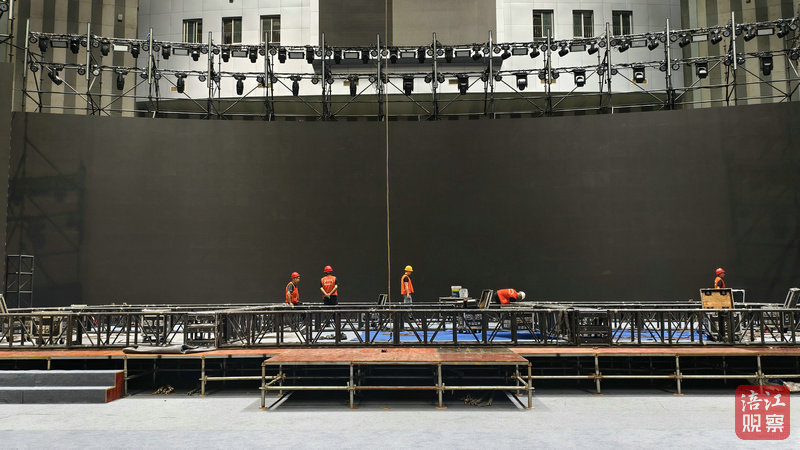 鋼琴與人形機器人背后的開幕式主舞臺上,巨大的異形主屏幕結(jié)構(gòu)已初具規(guī)模,工人們正進行最后的吊頂和異形梯步搭建。綿陽科發(fā)會展旅游有限責任公司副總經(jīng)理張琨向記者透露,預(yù)計將于今晚或明日凌晨完成主會場搭建工作。
