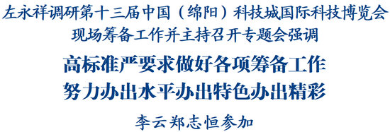 綿陽新聞網(wǎng)訊 第十三屆中國(綿陽)科技城國際科技博覽會將于9月26日至30日舉辦,目前各項籌備工作已進(jìn)入沖刺階段。9月19日,省委常委、市委書記左永祥調(diào)研第十三屆科博會現(xiàn)場籌備工作并主持召開專題會。他強調(diào),要深入學(xué)習(xí)貫徹習(xí)近平總書記關(guān)于科技創(chuàng)新的重要論述,全面落實黨中央和省委部署要求,堅持系統(tǒng)觀念,加強協(xié)作配合,高標(biāo)準(zhǔn)、嚴(yán)要求做好第十三屆科博會各項籌備工作,努力辦出水平辦出特色辦出精彩。