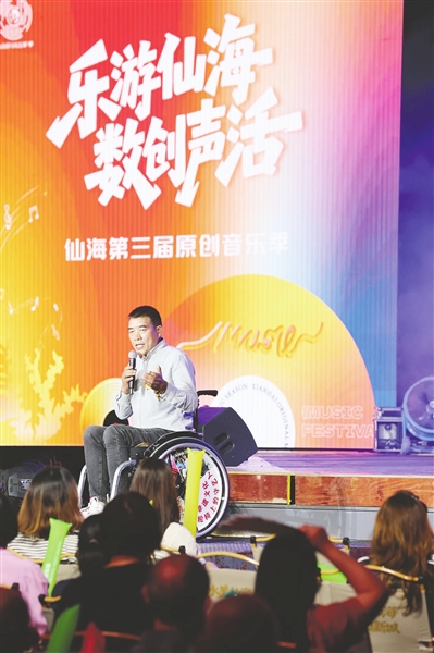 隨后,童祥瑞的《死在舞臺上》、李東陽的《折翅騰飛》、彭逐陽的《forme》、夏朝坤的《就在四川》接連上演。每位歌手都飽含對生活的熱愛激情演繹,賽后還分享了創(chuàng)作背后的故事。“第一次來仙海,第一次參加音樂季,特別興奮。這里景色美,體驗特別好。”參賽選手彭逐陽說。