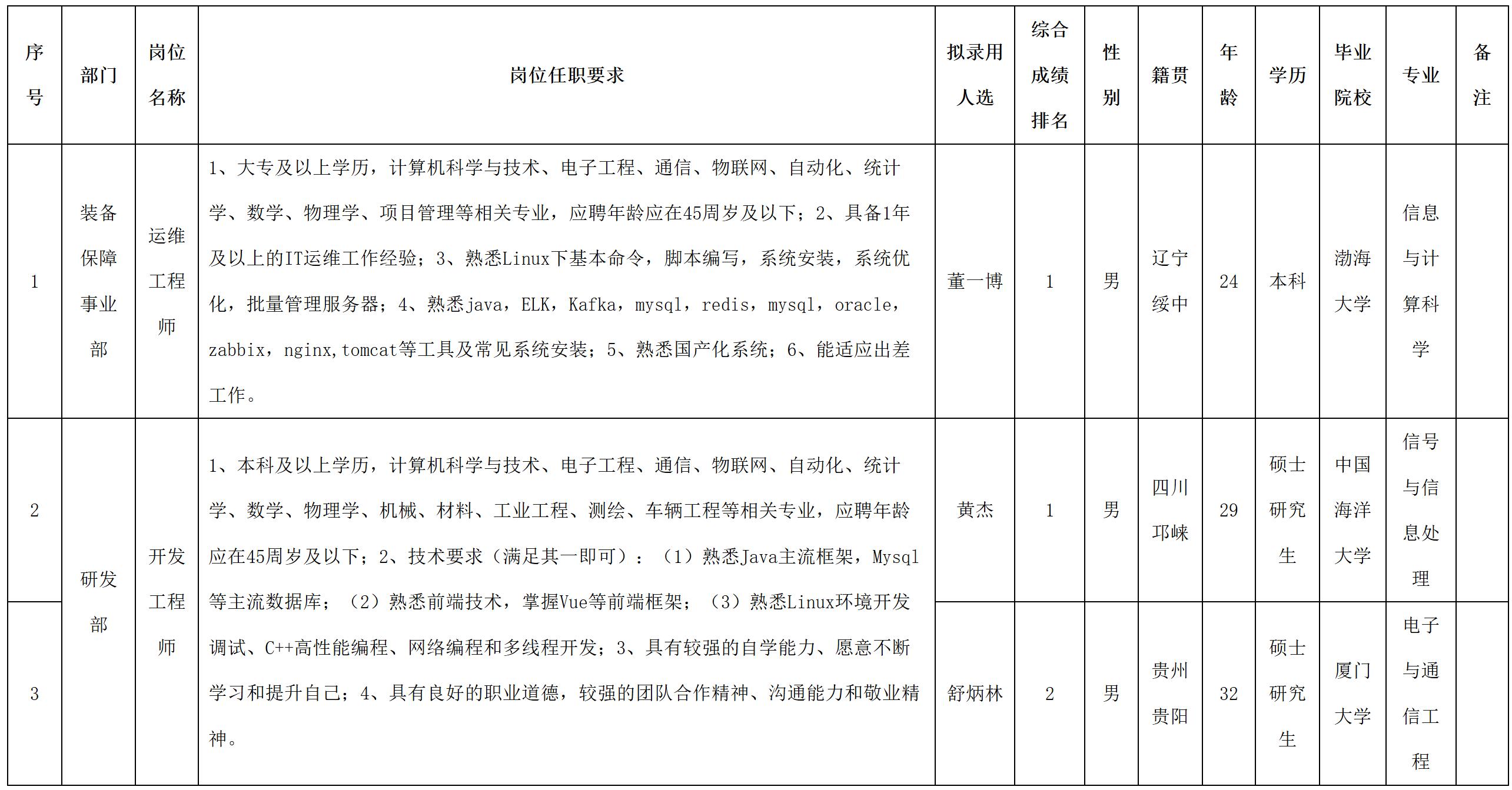 根據(jù)四川九洲投資控股集團(tuán)有限公司軟件與數(shù)據(jù)智能軍團(tuán)發(fā)布的招聘公告及招聘相關(guān)規(guī)定,經(jīng)筆試、面試、考察、體檢等程序,擬錄用董一博等3名同志到四川九洲投資控股集團(tuán)有限公司軟件與數(shù)據(jù)智能軍團(tuán)工作,現(xiàn)予以公示,具體情況如下: