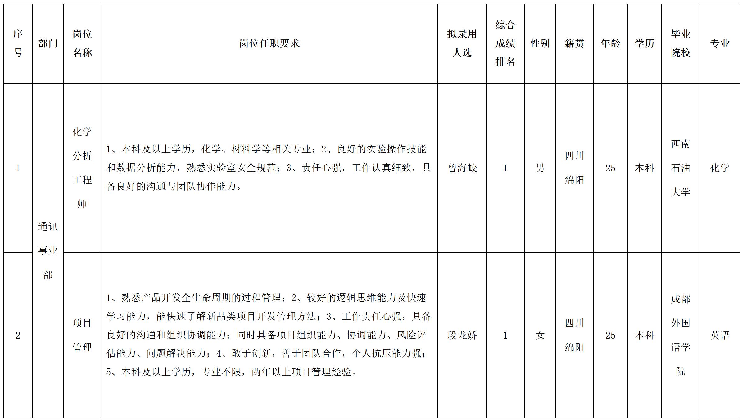 根據(jù)四川華豐科技股份有限公司發(fā)布的招聘公告及招聘相關(guān)規(guī)定,經(jīng)面試等程序,擬錄用曾海蛟等同志到四川華豐科技股份有限公司工作,現(xiàn)予以公示,具體情況如下: