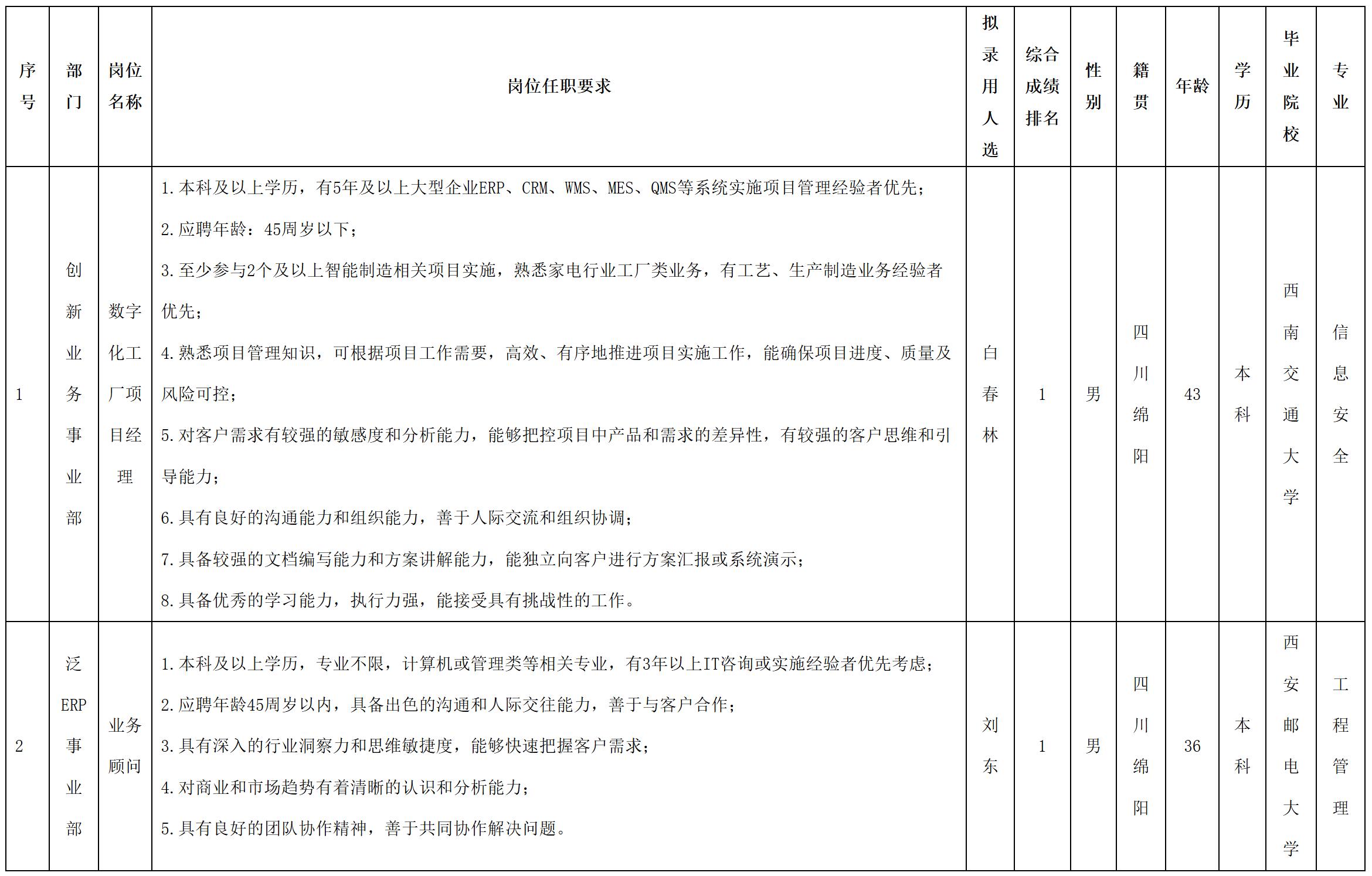 根據(jù)四川虹信軟件股份有限公司發(fā)布的招聘公告及招聘相關(guān)規(guī)定,經(jīng)面試、考察、體檢等程序,擬錄用白春林、劉東同志到四川虹信軟件股份有限公司工作,現(xiàn)予以公示,具體情況如下: