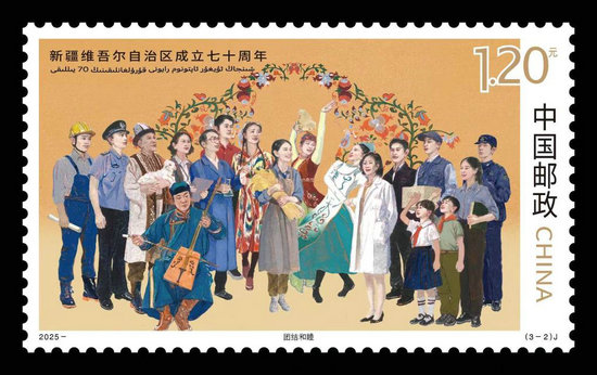 《新疆維吾爾自治區(qū)成立七十周年》紀(jì)念郵票。(新疆郵政供圖)
