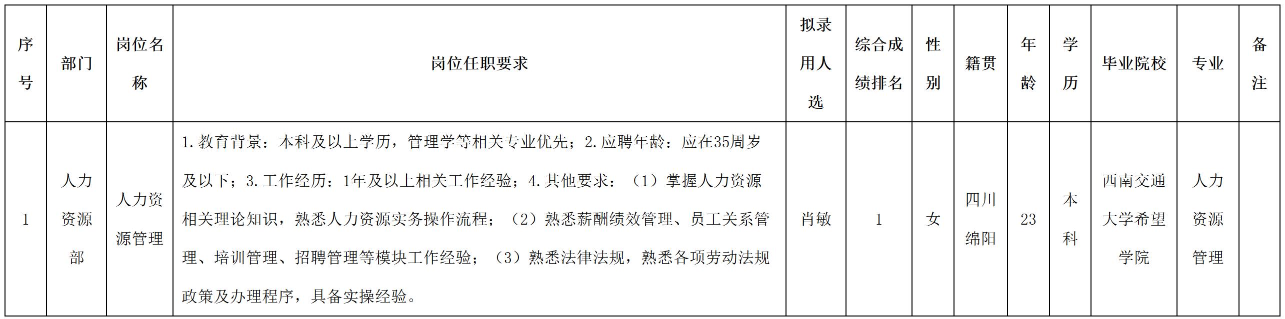 根據(jù)四川九州電子科技股份有限公司發(fā)布的招聘公告及招聘相關(guān)規(guī)定,經(jīng)筆試、面試、考察、體檢等程序,擬錄用肖敏同志到四川九州電子科技股份有限公司工作,現(xiàn)予以公示,具體情況如下: