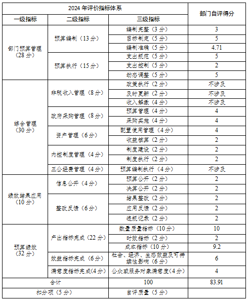 按照2024年度市本級部門整體支出績效評價體系及計分標(biāo)準(zhǔn),我單位較好的完成了本年度目標(biāo)任務(wù),整體績效評價結(jié)果為 “優(yōu)秀”。根據(jù)本部門收支情況、預(yù)算執(zhí)行情況、部門履職效益分析及整體績效管理情況綜合自評,剔除本部門不涉及指標(biāo),折算前得分為83.91分,折算后實際得分為95.35,自評等次為:優(yōu)秀。