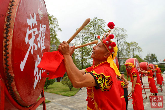 儀式現場,10面印著“榮耀出征”的戰(zhàn)鼓分列兩側,豐谷啦啦隊帶來開場表演后,戰(zhàn)鼓“咚!咚!咚!”奏響。