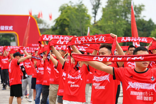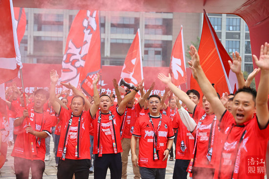 200余名球迷聯盟成員身著紅色助威服,揮舞隊旗齊聲高呼“綿陽九洲長虹隊,雄起!雄起!雄起!”