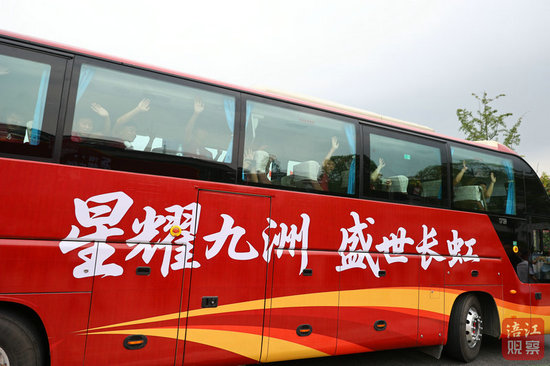 球隊大巴啟程時,現場球迷齊唱戰(zhàn)歌送行,球員們通過車窗揮手致意。