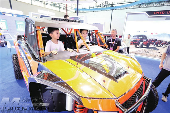 9月28日,在第十三屆中國(綿陽)科博會上,小觀眾體驗全地形越野車。