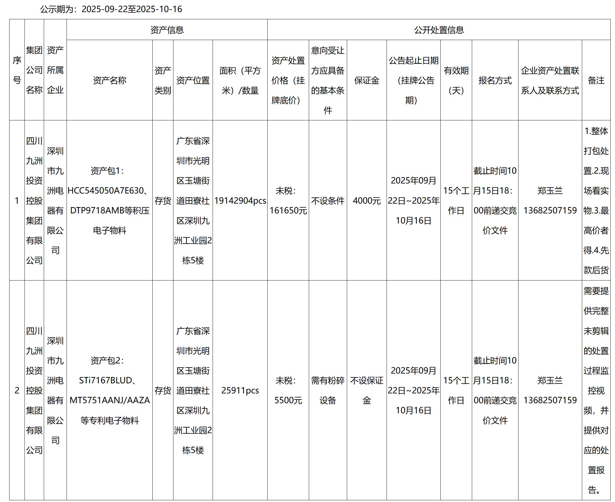 深圳市九洲電器有限公司資產(chǎn)處置公告