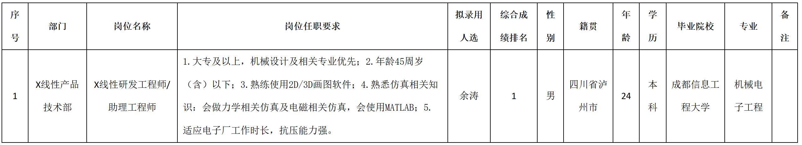 根據四川安和精密電子電器股份有限公司發(fā)布的招聘公告及招聘相關規(guī)定,經筆試、面試、考察、體檢等程序,擬錄用余濤同志到四川安和精密電子電器股份有限公司工作,現予以公示,具體情況如下: