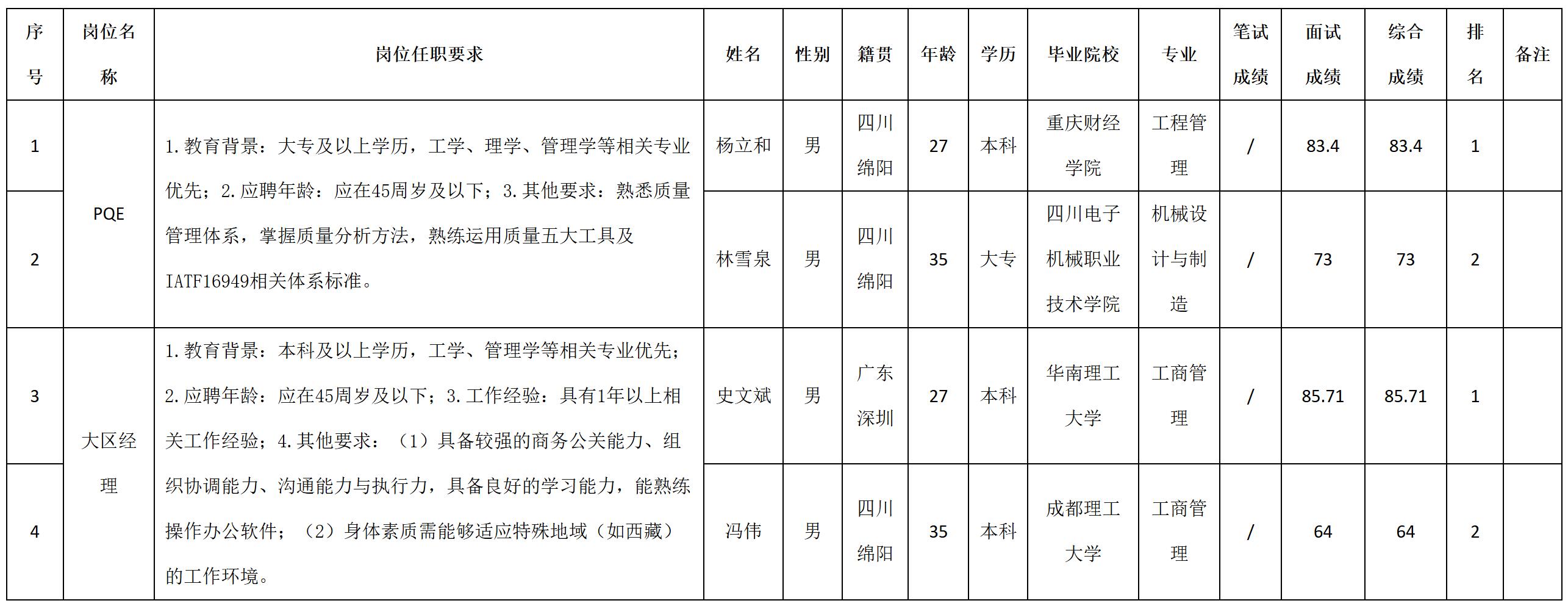 根據(jù)四川九州電子科技股份有限公司發(fā)布的招聘公告及招聘相關(guān)規(guī)定,經(jīng)筆試、面試等程序,現(xiàn)將筆試(面試)成績予以公示。