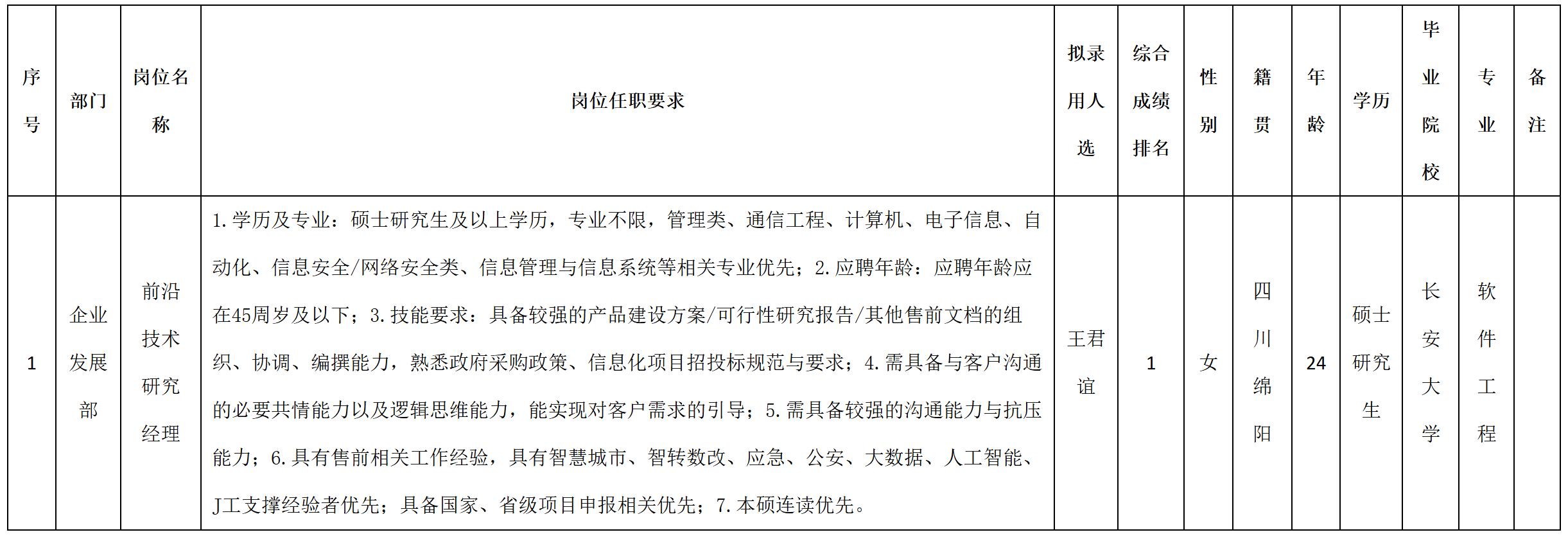 根據(jù)四川九洲投資控股集團(tuán)有限公司軟件與數(shù)據(jù)智能軍團(tuán)發(fā)布的招聘公告及招聘相關(guān)規(guī)定,經(jīng)筆試、面試、考察、體檢等程序,擬錄用王君誼同志到四川九洲投資控股集團(tuán)有限公司軟件與數(shù)據(jù)智能軍團(tuán)工作,現(xiàn)予以公示,具體情況如下: