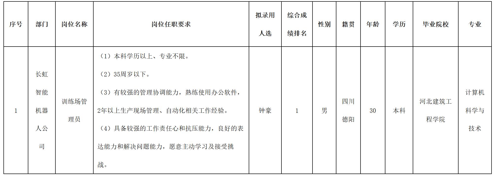 根據(jù)四川長(zhǎng)虹虹微科技有限公司發(fā)布的招聘公告及招聘相關(guān)規(guī)定,經(jīng)面試,擬錄用鐘豪同志到公司工作,現(xiàn)予以公示,具體情況如下: