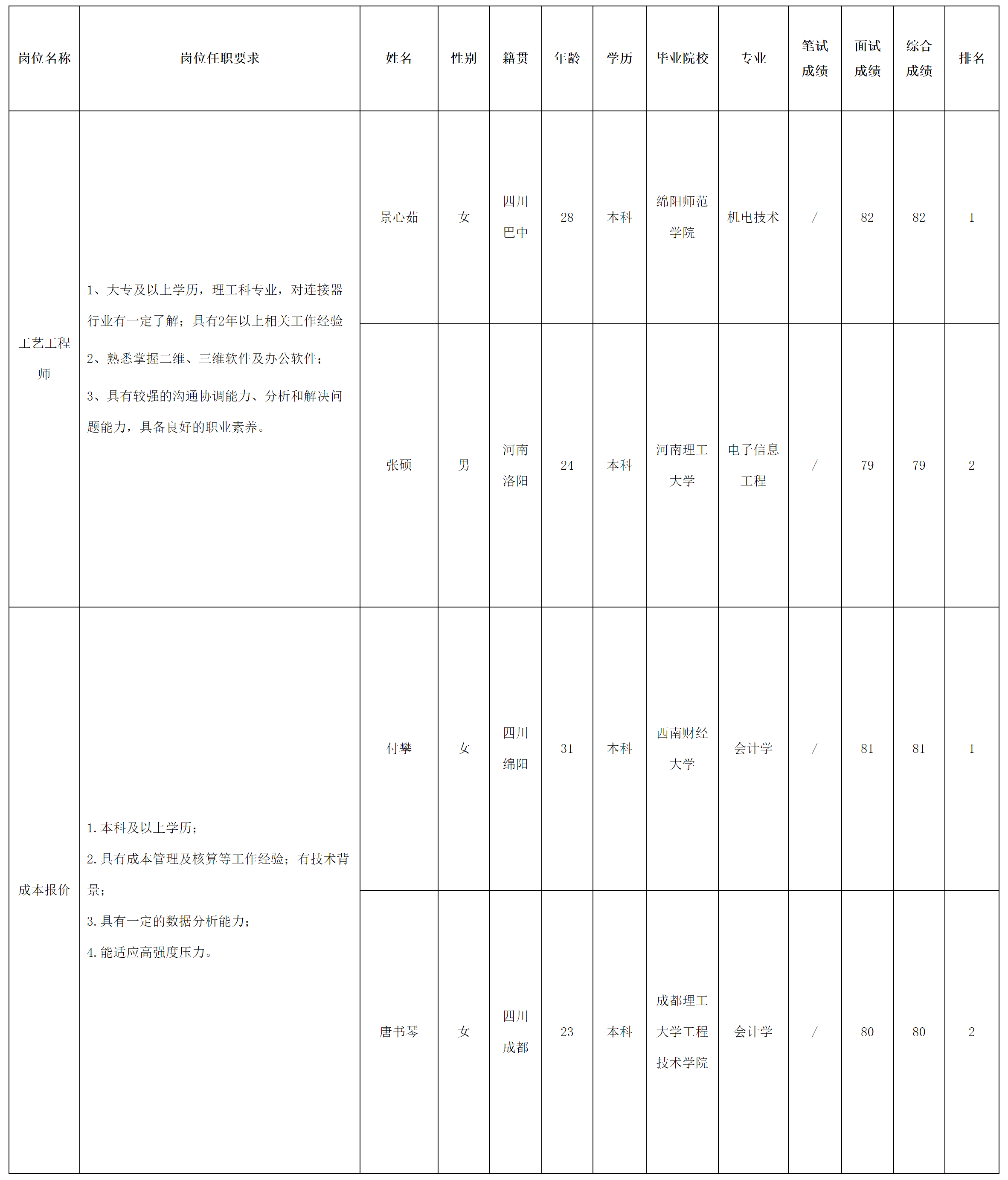 根據(jù)四川華豐科技股份有限公司發(fā)布的招聘公告及招聘相關(guān)規(guī)定,經(jīng)面試等程序,現(xiàn)將面試成績(jī)予以公示。