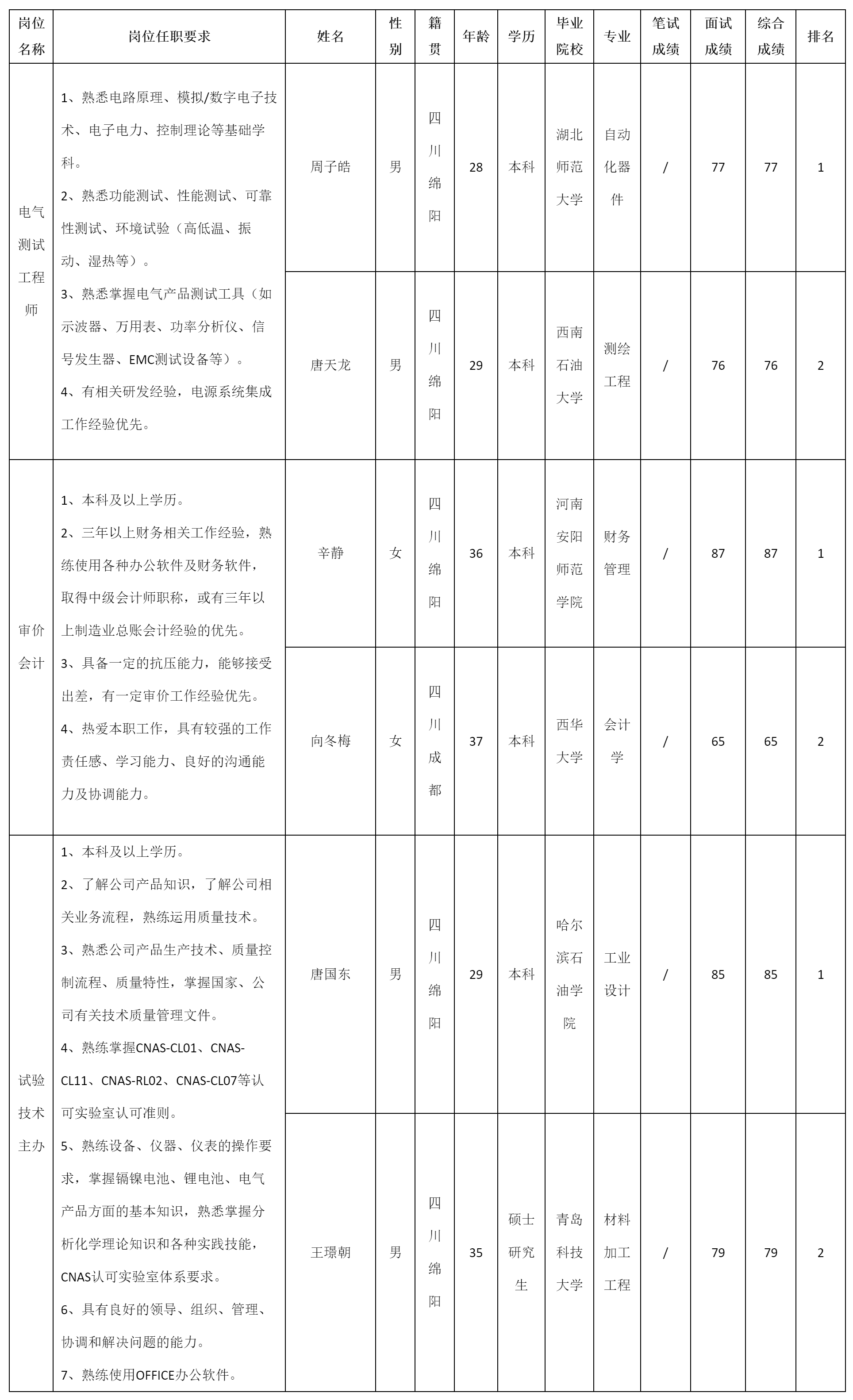 根據(jù)長(zhǎng)虹電源公司發(fā)布的招聘公告及招聘相關(guān)規(guī)定,經(jīng)面試等程序,現(xiàn)將面試成績(jī)予以公示。