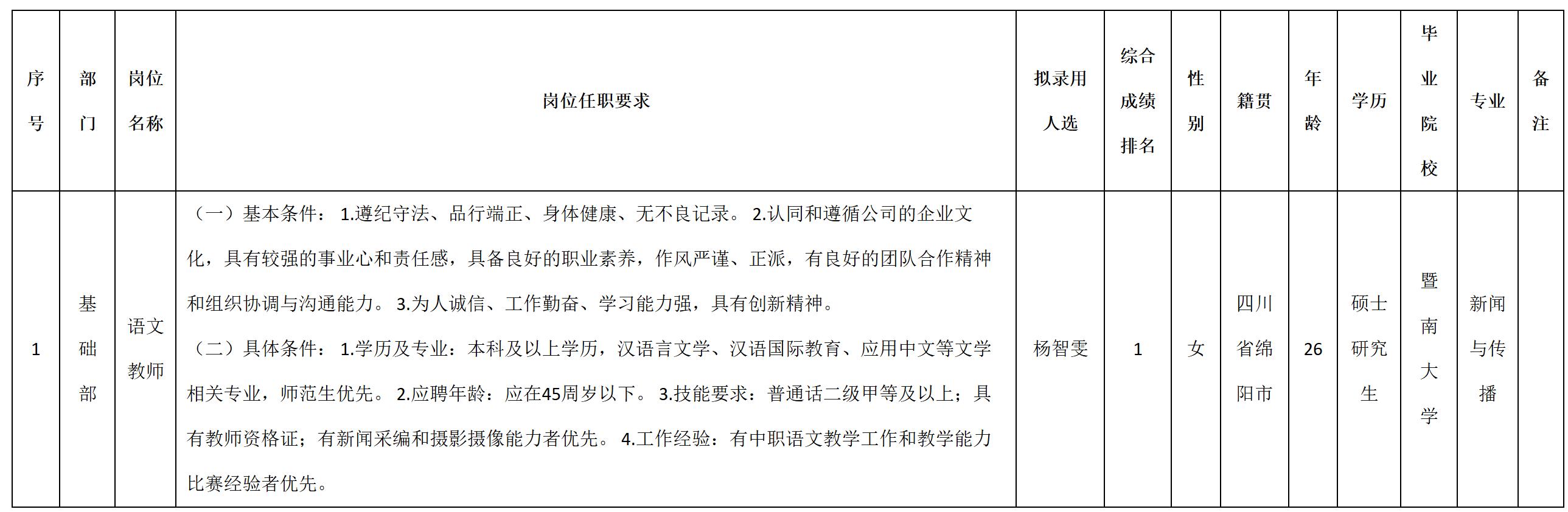 根據(jù)四川九洲教育投資管理有限公司發(fā)布的招聘公告及招聘相關(guān)規(guī)定,經(jīng)測試、考察、體檢等程序,擬錄用楊智雯同志到四川九洲教育投資管理有限公司工作,現(xiàn)予以公示,具體情況如下: