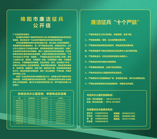 綿陽市廉潔征兵公開信 廣大應(yīng)征青年及家長: 依法服兵役是每個適齡青年的應(yīng)盡義務(wù),參軍報國是每名有志青年的光榮選擇,我們向全市廣大應(yīng)征青年踴躍報名參軍表示熱烈歡迎! 兵員征集是國防和軍隊建設(shè)的基礎(chǔ)工程,是從源頭上純潔鞏固部隊、實現(xiàn)..[