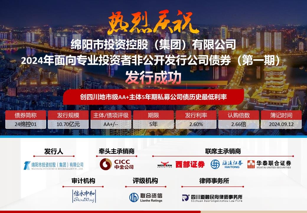 2024年9月12日,綿投集團(tuán)成功發(fā)行2024年第一期10.7億元私募公司債,期限5年、票面利率2.60%/年,創(chuàng)四川省地級市AA+主體評級非公開發(fā)行公司債5年期歷史最低票面利率。此次債券成功發(fā)行,進(jìn)一步優(yōu)化了集團(tuán)債務(wù)期限結(jié)構(gòu)、降低了集團(tuán)融資成本,同時反映了市場對集團(tuán)未..[
