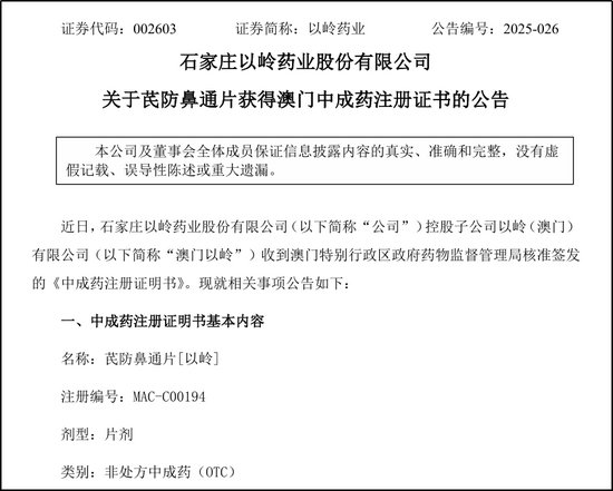 7月11日晚,以嶺藥業(yè)發(fā)布公告稱,該公司控股子公司以嶺(澳門)有限公司收到澳門特別行政區(qū)政府藥物監(jiān)督管理局(以下簡稱“澳門藥監(jiān)局”)核準(zhǔn)簽發(fā)的《中成藥注冊證明書》。[