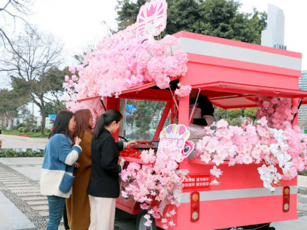 3月6日中午,在園藝山集中辦公區(qū),一輛載滿粉色玫瑰的流動打卡車停在廣場上,聞訊而來的姑娘們將車圍得水泄不通。這輛“婦女節(jié)移動盲盒”特別班車,正在開啟一場春日限定的浪漫奇遇記。[