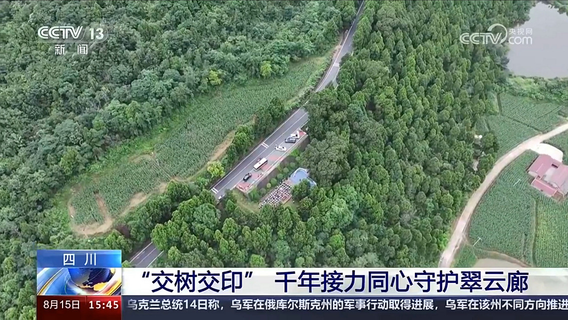 8月15日,央視CCTV-13《新聞直播間》關注綿陽梓潼“交樹交印”,千年接力同心守護翠云廊。[