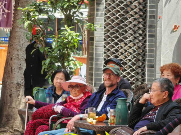 陽光透過樹葉的縫隙,帶來絲絲熱氣。不斷有戲迷前來,他們熱情地與葛安喬打招呼,“美國朋友,歡迎你來看川劇”。葛安喬用滿臉的微笑回應,并送上一句,“你好”。 [