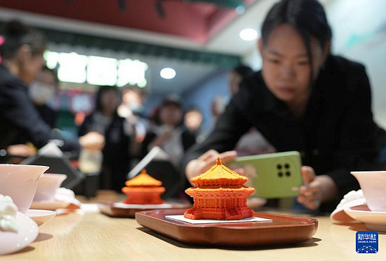 5月10日,在沈陽故宮,一名游客拍攝“大政殿慕斯蛋糕”。 近日,沈陽故宮博物院正式推出兼顧造型與口感的“美食文創(chuàng)”新品,滿足游客多元化消費需求。[